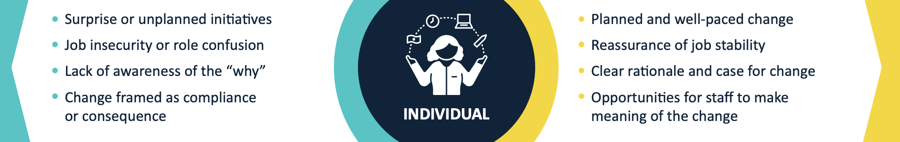 At the individual level, surprise initiatives, job insecurity, and change framed as compliance breed withdrawal. The remediator? Planned, well-paced change with clear rationale, reassurance of job stability, and real opportunities for staff to make meaning of the work.