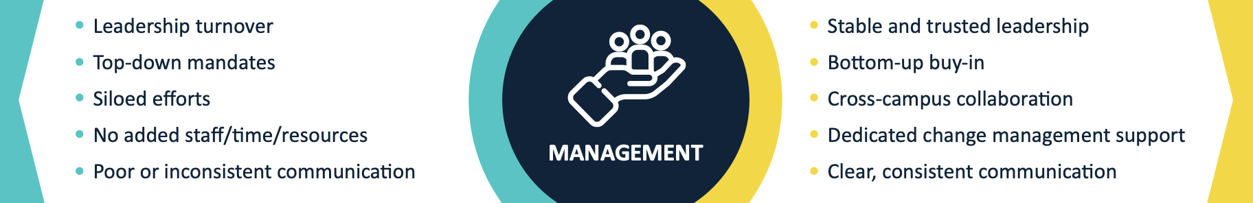 At the management level, leadership turnover, siloed implementation, and no additional time or resources fuel burnout. The remediator? Stable, trusted leadership with cross-campus collaboration and dedicated change management support.