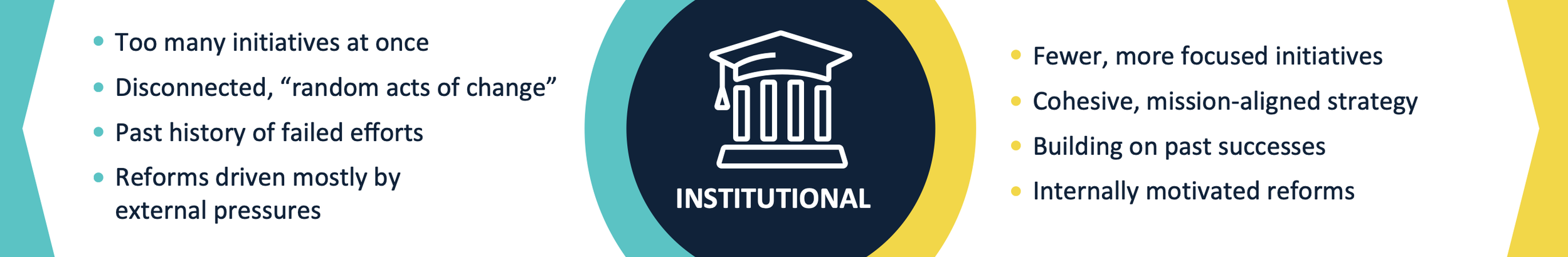 At the institutional level, too many initiatives at once, disconnected from mission and driven by external pressure, pushes toward fatigue. The remediator? Fewer, more focused initiatives tied to a cohesive institutional strategy that builds on past successes rather than starting from scratch.