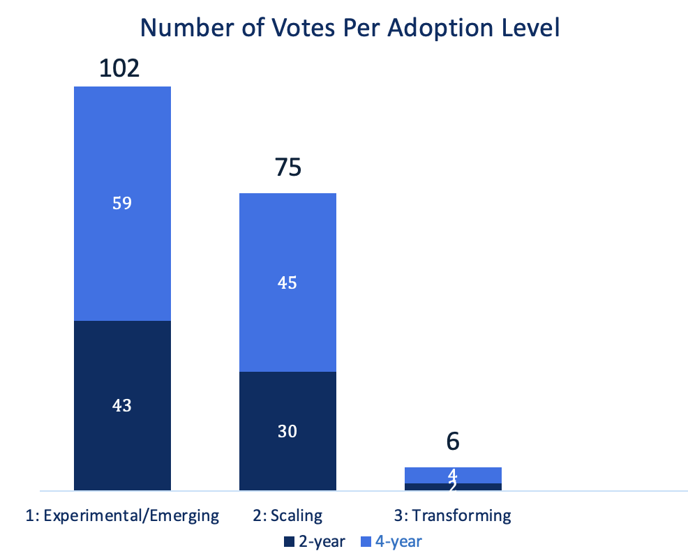 We could see participants in real-time assessing their institutions’ AI adoption, and upon analyzing this data, the results were in line with what we found in our national study. Similar to the results we shared in our report, campuses were overwhelmingly in earlier to middling stages of AI adoption.